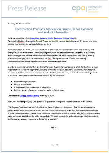 CPA Deputy Chief Executive and Policy Director, Peter Caplehorn, commented: “The evidence base we are seeking will be a vital contribution to our work on reform post-Grenfell Tower fire. The survey results will help us make recommendations to ensure that consistent, unambiguous and clear product information on construction materials is made available to the wider supply chain. We need no reminder of how important this information is and I encourage as many responses to the survey as possible.”